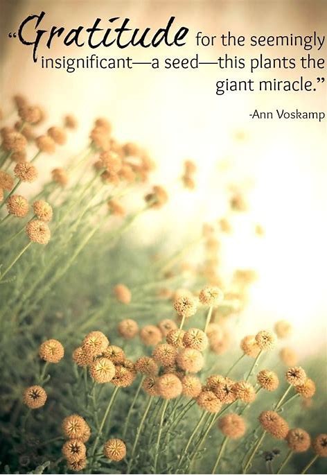 This image shows a field of flowers with a quote by Ann Voskamp: “Gratitude for the seemingly insignificant-a seed-this plants the giant miracle.”